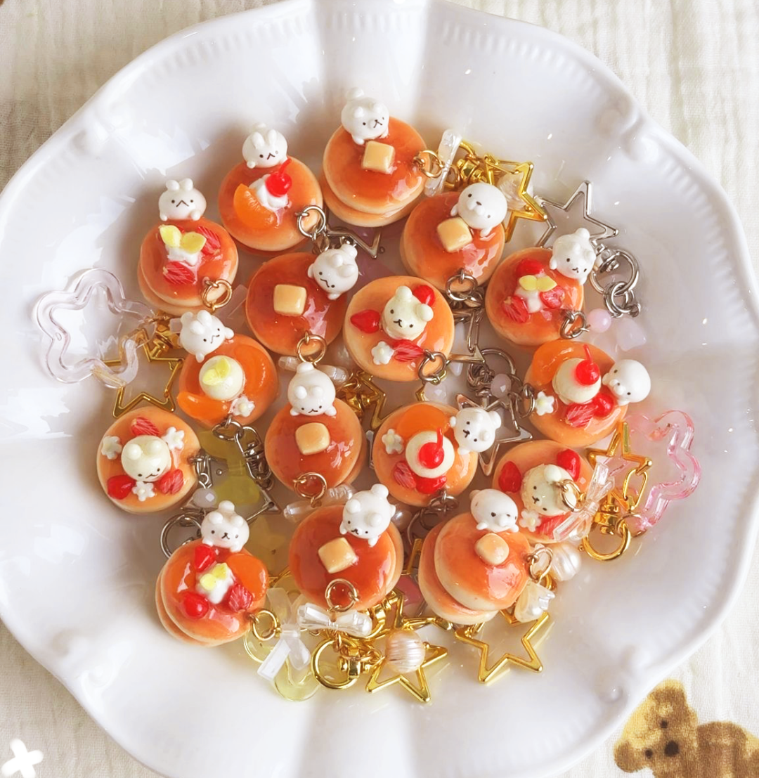 Pancake keychains with various characters hanging on top of it, bringing a charming and adorable vibe to your collection of accessories.